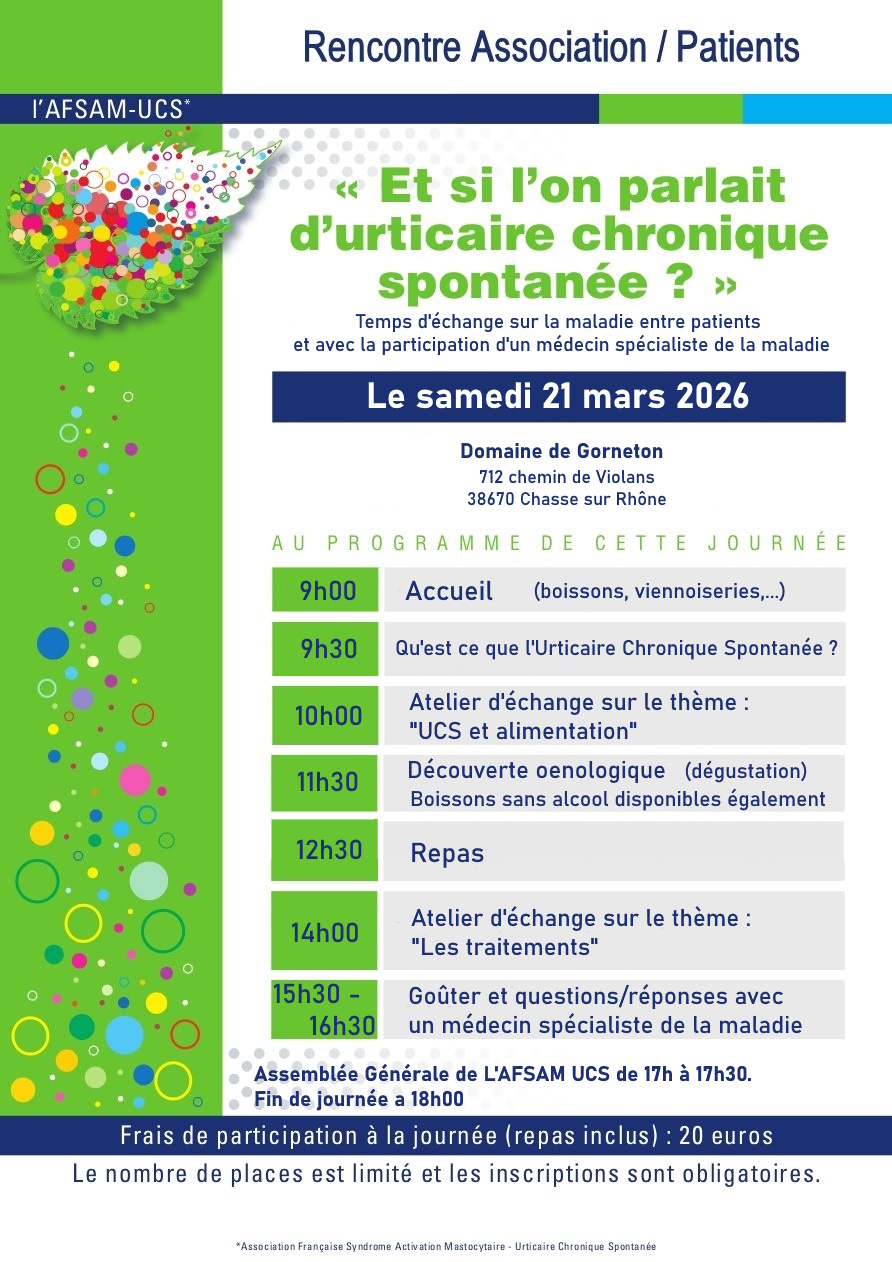 Nous organisons à proximité de Vienne (38), une rencontre association patients ouverte à tous les patients ayant un diagnostic d'Urticaire Chronique Spontanée établi.